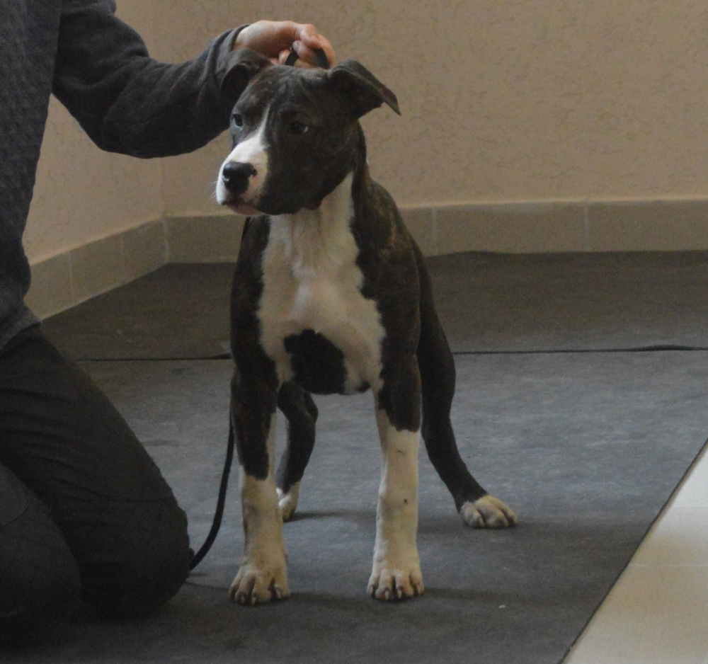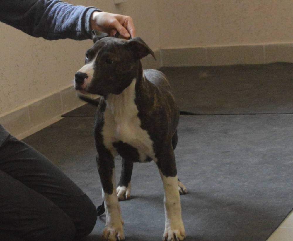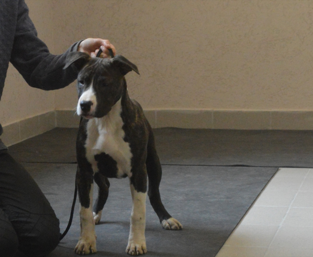 Щенок АСТ, мальчик, 5 месяцев, уши купированы, окрас тигровый с белым.