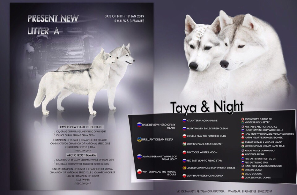 Dam: ARCTIC FROST BAVARIA(JCH, CH BY, CH RUS ALAPA SIBERIANS TWINKLE OF POLAR LIGHT & JCH, GRAND CH RUS WINTER BALLAD THE FUTURE IS OURS )