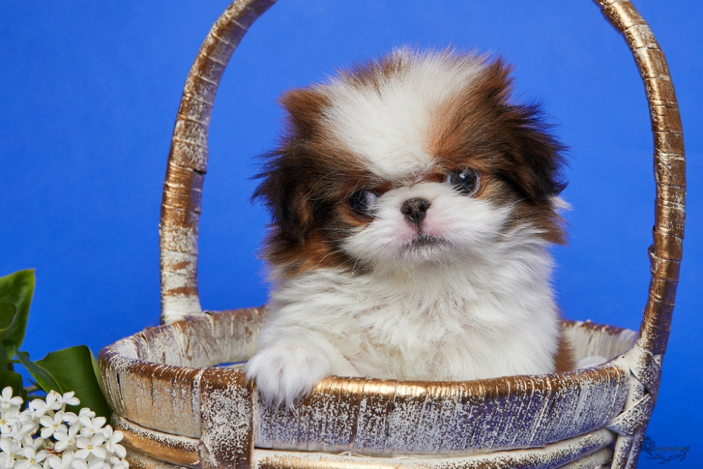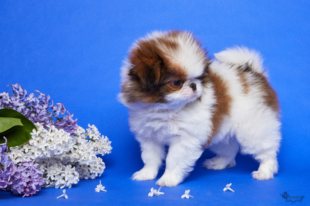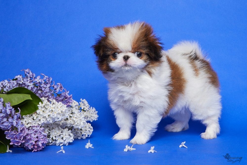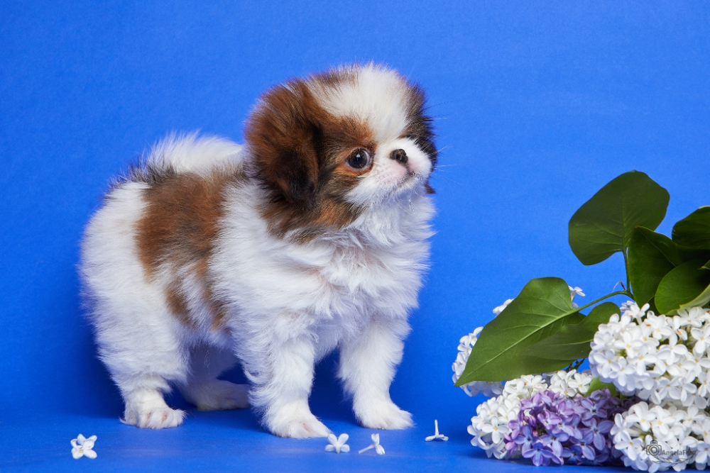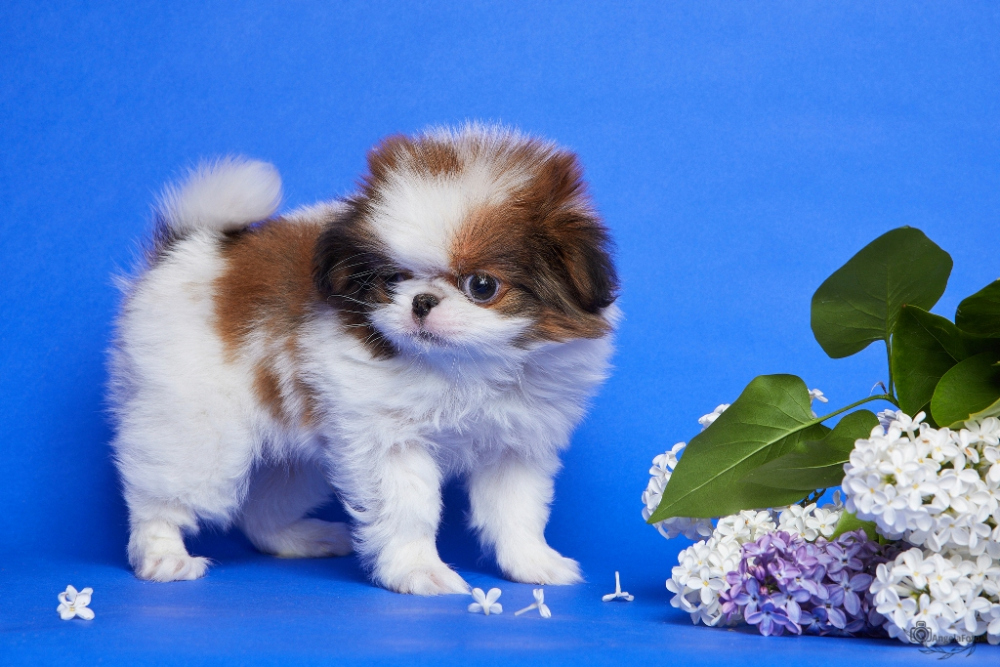 Щенок породы японского хина, бело-рыжего окраса. Прививки по возрасту, клеймо. Документы РКФ-ФЦИ. Компактный, прикус норма, все на месте. Перспективен для выставок.